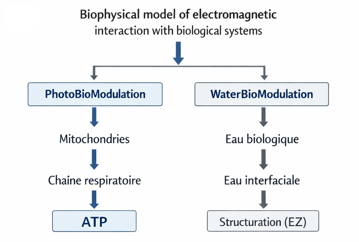 Si le rayonnement électromagnétique peut interagir avec les chromophores mitochondriaux mais aussi avec la structuration de l’eau biologique alors il devient possible d’envisager deux niveaux d’interaction biophysique :