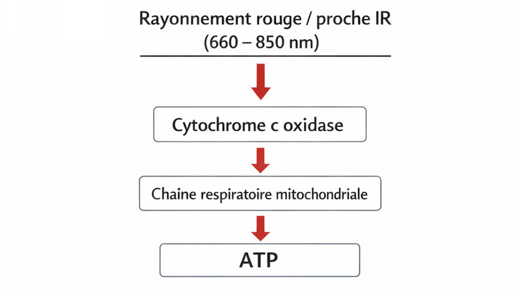 La PhotoBioModulation (PBM) repose sur l’interaction entre certaines longueurs d’onde du rayonnement électromagnétique et des chromophores biologiques. Parmi ces chromophores, la cytochrome c oxydase, enzyme clé de la chaîne respiratoire mitochondriale, occupe une place centrale. Sous l’effet de certaines longueurs d’onde lumineuses, plusieurs phénomènes biologiques ont été observés :