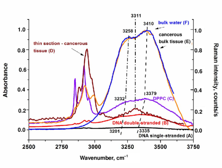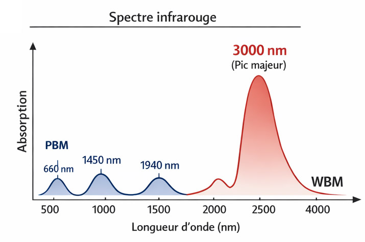 Ces longueurs d’onde pénètrent efficacement les tissus biologiques et interagissent avec certains chromophores cellulaires. Cependant, du point de vue de la spectroscopie infrarouge de l’eau, les bandes d’absorption les plus marquées de l’eau liquide se situent autour de : 1450 nm, 1940 nm et surtout 3000 nm.