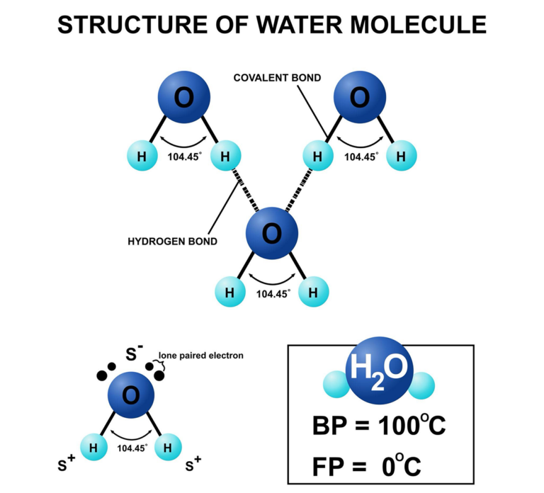 La molécule d’eau possède une structure géométrique particulière. L’angle entre les liaisons O–H est d’environ 104,5°., Ceci confère à la molécule d’eau une polarité électrique importante.